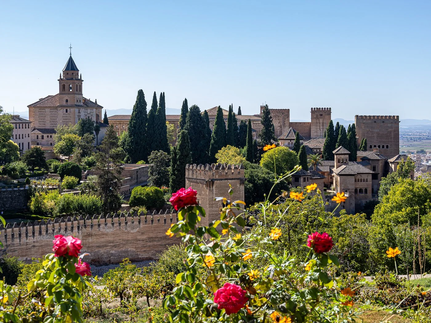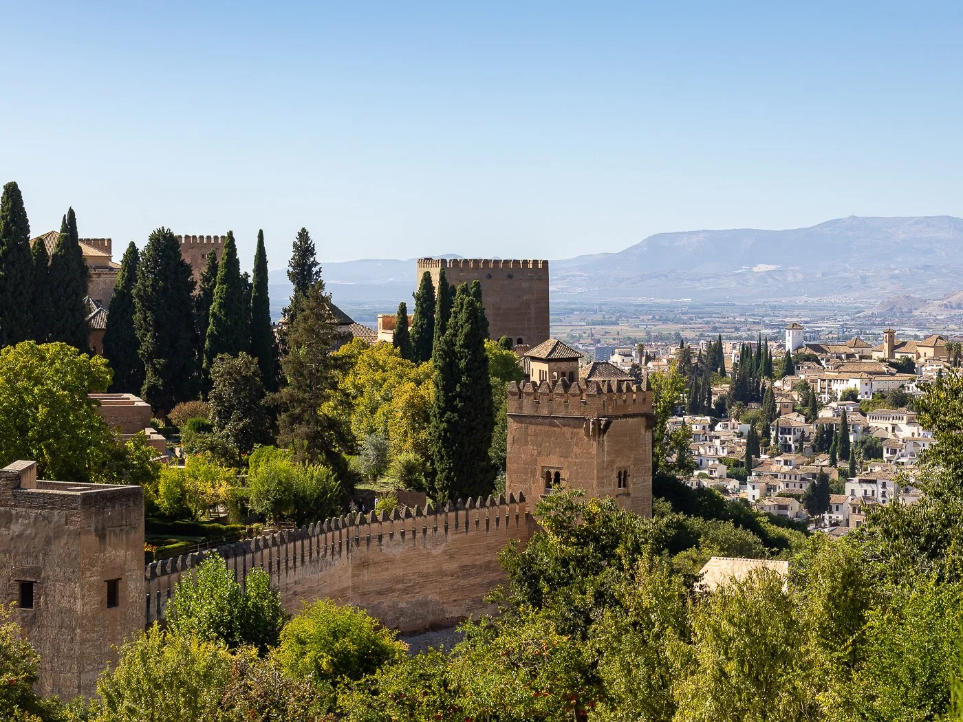 From the upper gardens of the Generalife, the Alhambra’s defensive walls and towers unfold across the hillside. The geometry of the fortress contrasts beautifully with the soft cypress silhouettes and the brightness of the Albaicín below.