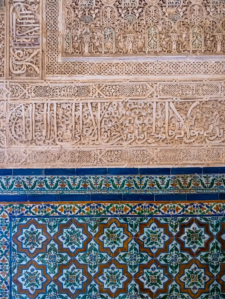 This close-up of the Nasrid wall decoration in the Palacio de Comares highlights the extraordinary craftsmanship that defines the Court of the Myrtles. Delicate carved inscriptions and geometric motifs flow seamlessly into vibrant tilework below, creating a harmony of texture, color, and rhythm.