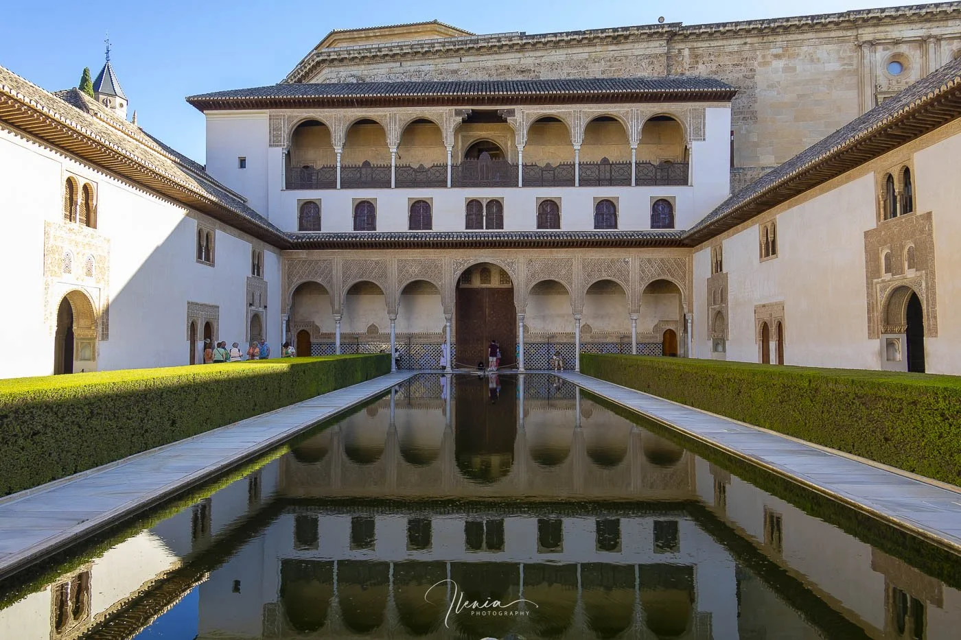 The Court of the Myrtles is one of the most serene spaces in the Nasrid Palaces. The long reflecting pool mirrors the arches and carved stucco, creating a perfect balance between light, geometry, and water. Standing here, you feel the quiet elegance that defines the heart of the Alhambra.