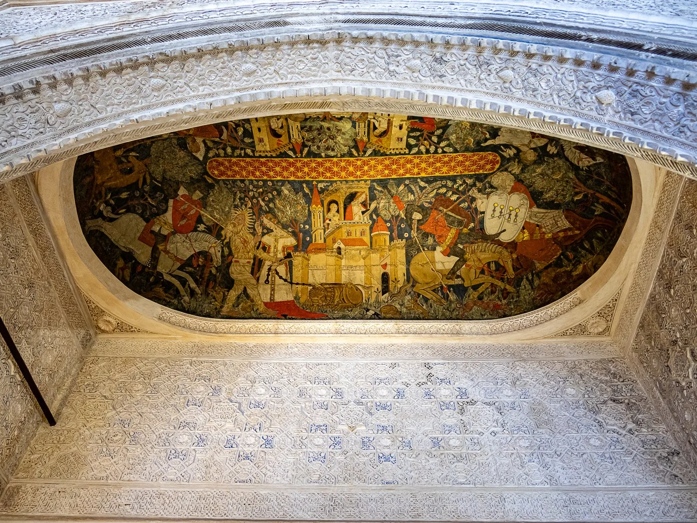 Inside the Sala de los Reyes, the painted ceiling immediately captures the eye with its vivid medieval scenes and intricate storytelling. Surrounded by delicate Nasrid plasterwork, the mural feels both unexpected and perfectly at home within the palace’s blend of cultures.