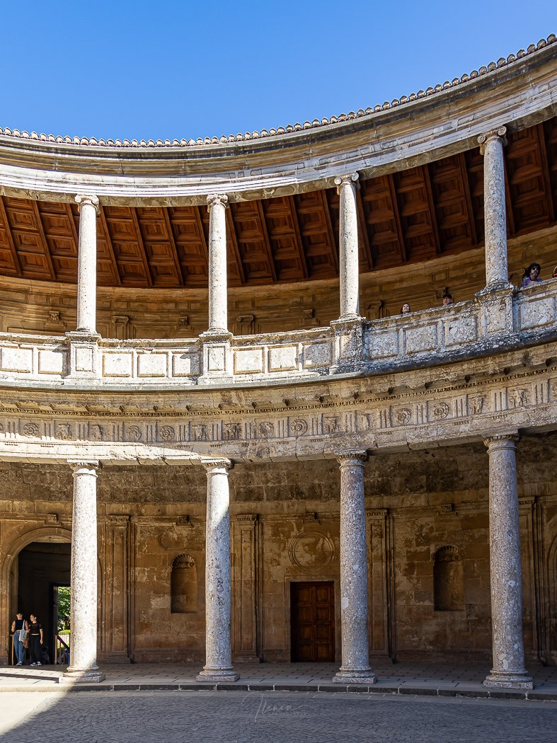 Stepping into the circular courtyard of the Palace of Charles V feels like entering a completely different world within the Alhambra. Its Renaissance geometry, grand stone columns, and perfect symmetry stand in striking contrast to the surrounding Nasrid palaces. The light shifts beautifully across the interior, revealing textures carved by centuries.