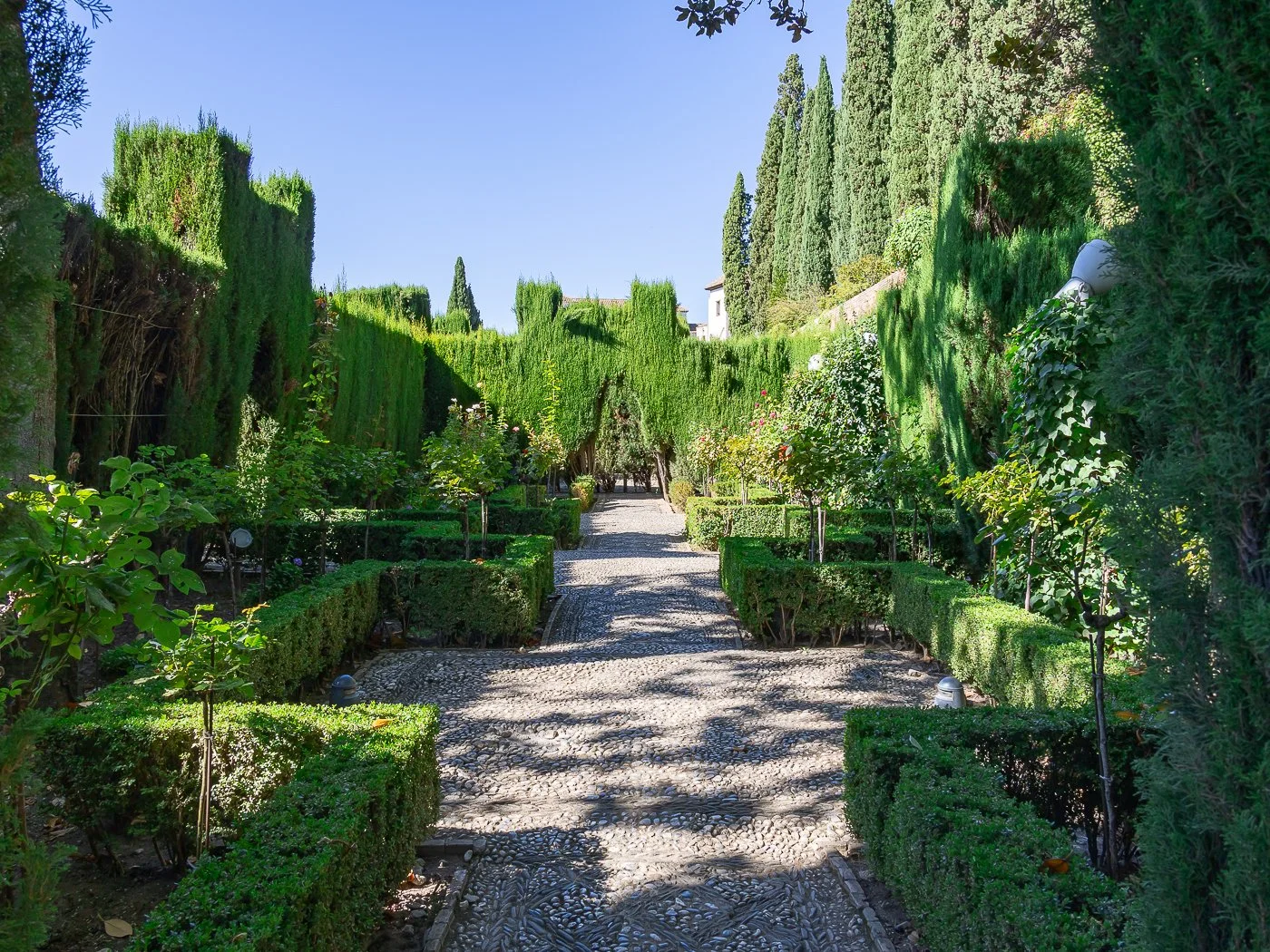 The Lower Gardens of the Generalife feel like a quiet passageway into another time. Pebbled paths, sculpted hedges, and rows of roses create a rhythm that invites you to slow down.