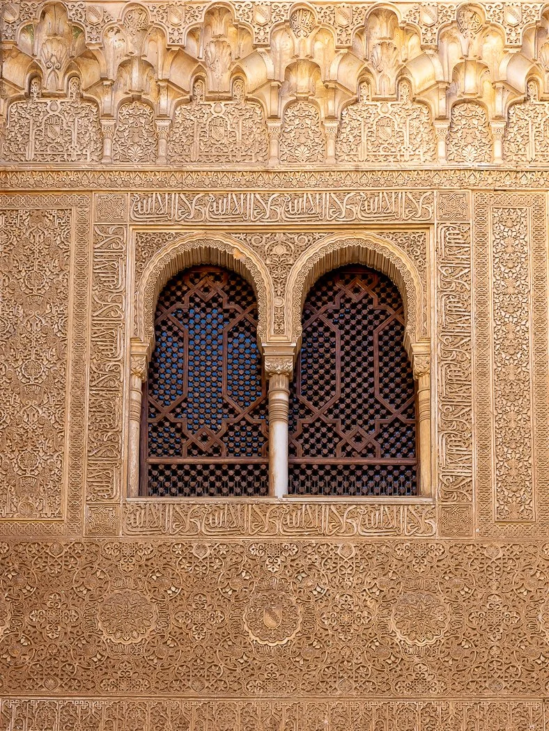 The façade of the Patio de los Arrayanes is one of the finest examples of Nasrid craftsmanship. Its lace-like stucco, carved with verses and geometric patterns, was designed to reflect both light and meaning. Standing before it, you feel the quiet precision of an art form meant to inspire contemplation and awe.