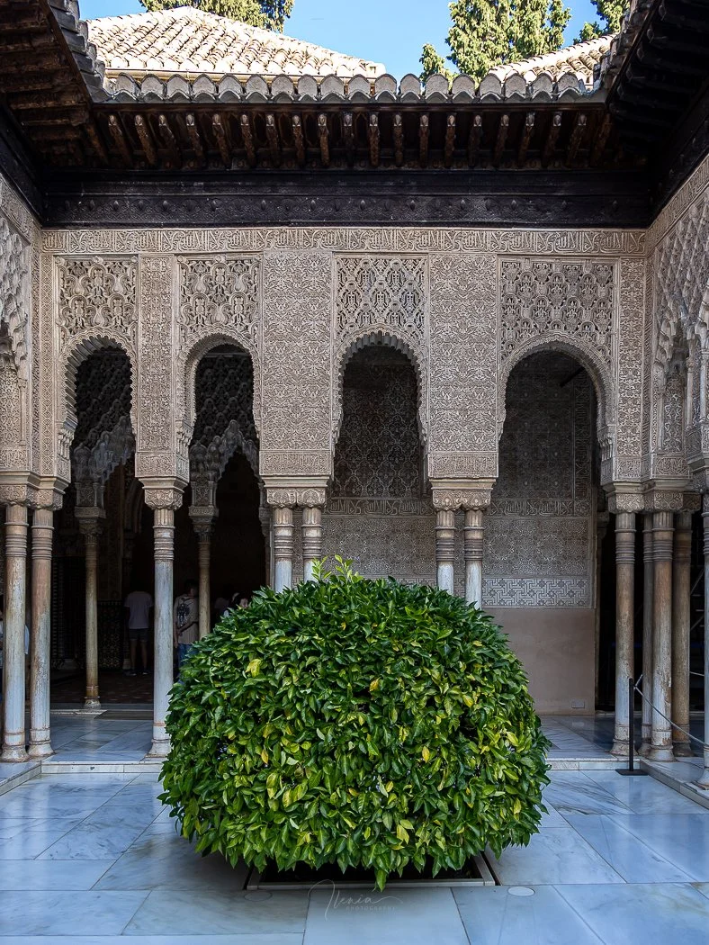 Just off the Patio de los Leones, near the Sala de los Reyes, the courtyard reveals a quieter side of the Nasrid Palaces. The intricate stucco work and slender marble columns frame a simple, rounded shrub that feels almost like a living sculpture.