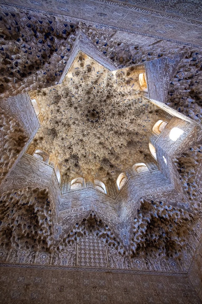 Standing beneath the Muqarnas dome of the Hall of the Abencerrajes feels like entering a celestial chamber carved entirely from light. Each detail catches the glow from the small windows above, creating a shimmering canopy that seems to float overhead.