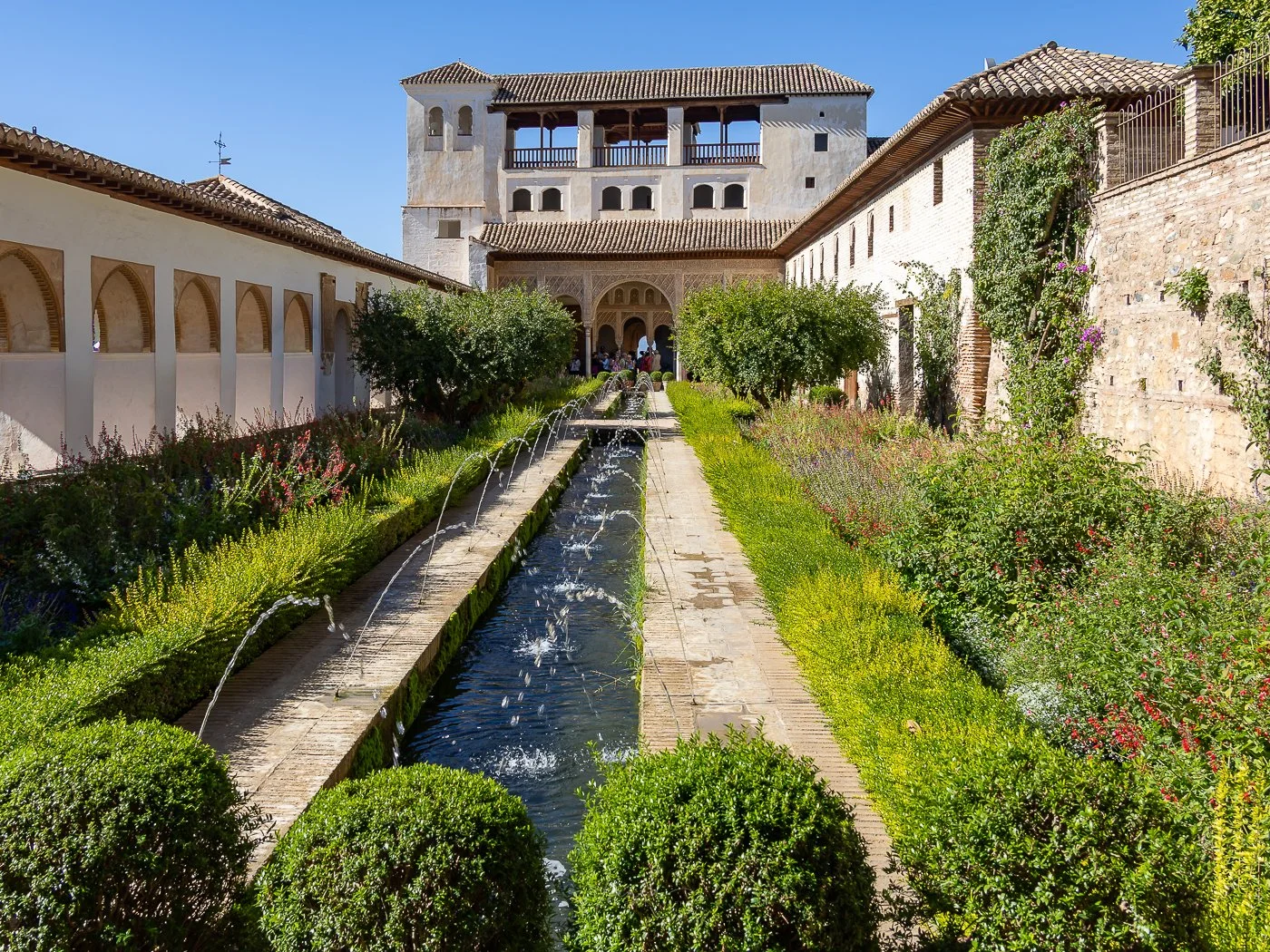 The Patio de la Acequia is the heart of the Generalife, where water becomes both architecture and music. Its long central channel, framed by rhythmic jets and vibrant garden beds, leads the eye toward the summer palace of the Nasrid rulers. Standing here, you can feel why this space was designed as a sanctuary of rest and contemplation. The balance of light, water, and greenery makes it one of the most peaceful corners of the entire Alhambra.