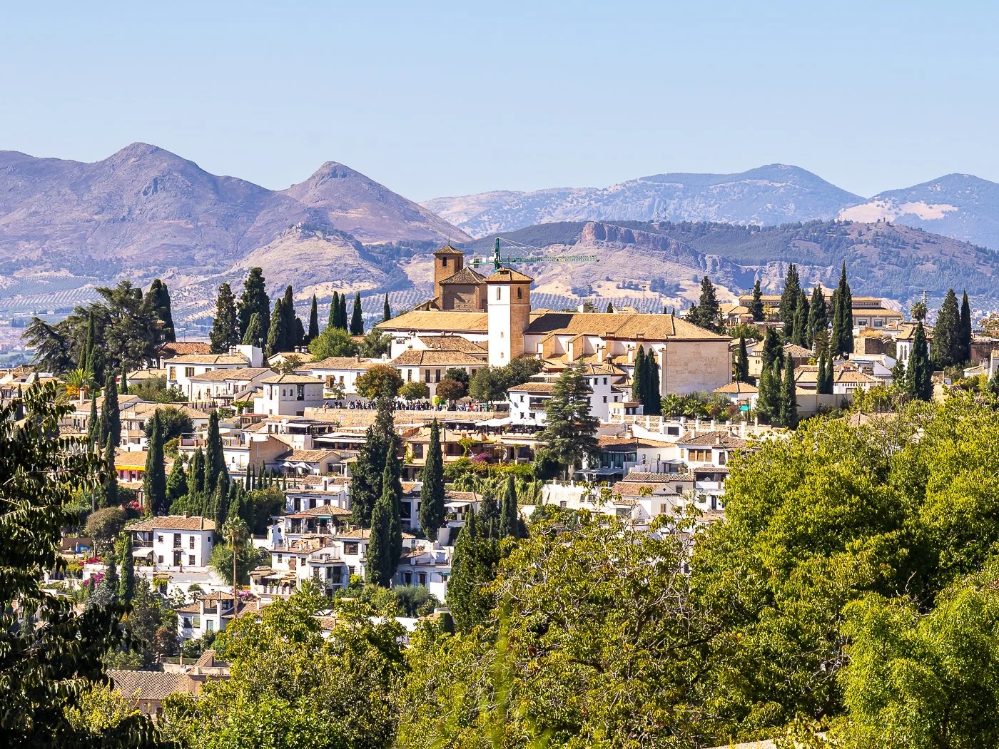 From the Generalife side, the Albaicín rises in soft layers of white houses, terracotta roofs, and cypress silhouettes. Its steep, winding streets seem to fold into the hillside, carrying centuries of Moorish heritage in their layout and rhythm.